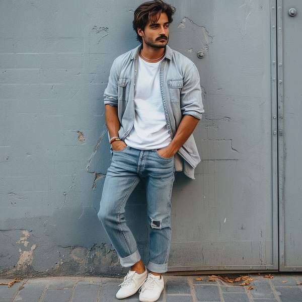 男生蓝色牛仔裤配什么上衣,男生蓝色牛仔裤穿搭指南,百搭上衣款式全解析